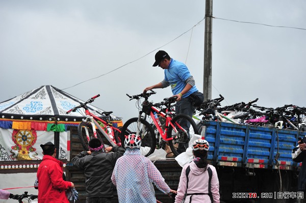 不参加骑游的车友们将车辆装在大卡车上