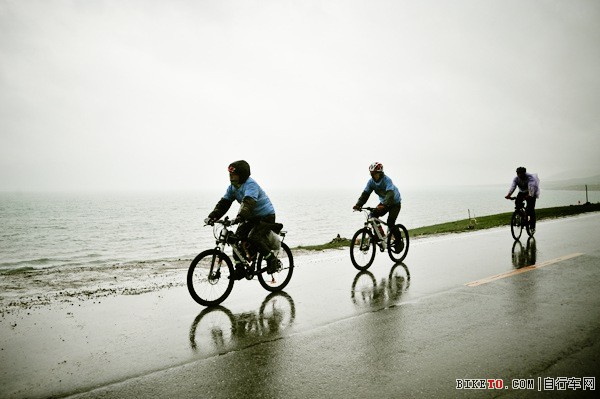 在车友骑游路上精彩瞬间,一旁便是美丽的青海湖