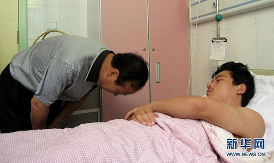 6月7日,延安市城管局局长张建超就延安城管暴力执法事件向受害者刘国峰(右一)鞠躬道歉。