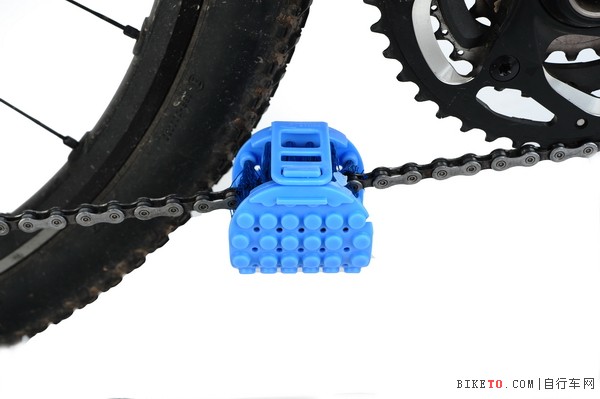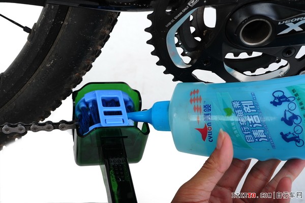 加入赛领专用清洁剂(另购),摇动曲柄让链条刷过,刷柄还可以垂直和多方向刷