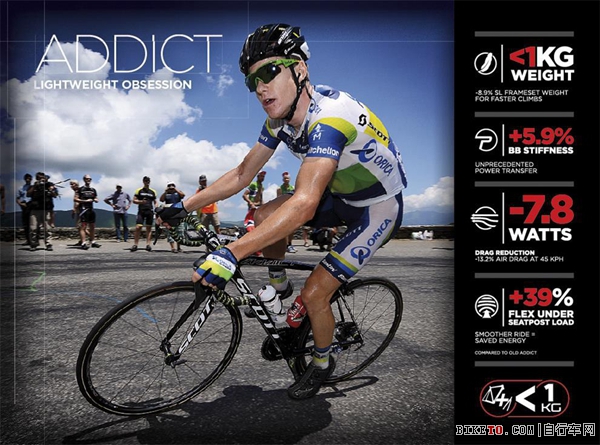 从车架的定位设计来说,在轻量、舒适、刚性、空气动力中,Addict将轻量的特性发展到极致,并尽可能兼顾其他三个区块。