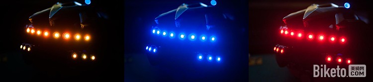 三种颜色的警示灯间歇闪烁,闪着警示灯来骑行很炫酷。