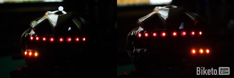 闪盔背后有两组LED灯珠,充电会亮红灯,而且可以利用手机APP可以控制这些LED灯的闪烁,提供警示和转向提醒功能。