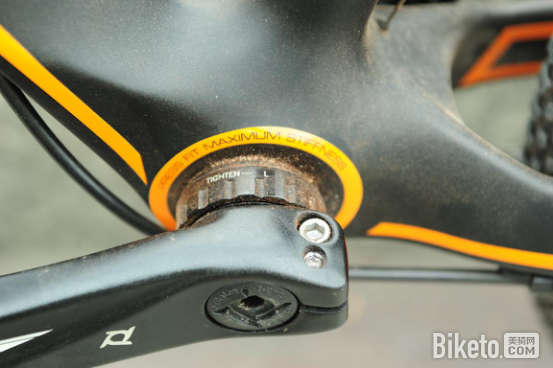 车架五通位置写着“PRESS FIT MAXIMUM STIFFNESS”,翻译过来大概意思是“压入式五通带来极致刚性”,然而车架采用的是螺纹五通,汉子猜测应该是工厂最初计划使用压入式五通,但最终定稿选用了螺纹五通,而喷漆涂装还未跟进,导致了这一尴尬,预计量产版就看不到这一圈字母了,作为曾经在某自行车工厂摸爬滚打的“内部知情人士”,汉子表示这样的事情并不稀奇。