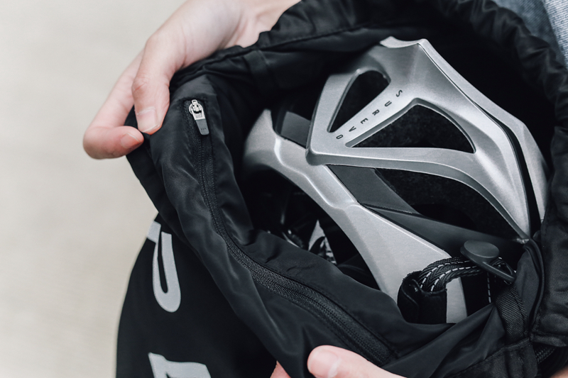 内部空载时,帽袋亦可压缩置于骑行服后部口袋,精简骑行时的每一分空间。