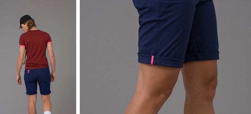 170GSM的棉质面料轻薄透气且具有伸缩性,在炎热的夏天也能带给骑行者凉爽舒适的感受。拉链口袋的设计可以避免骑行过程中物品掉落,裤腿翻折后的粉色条纹和反光细节增加可视度。