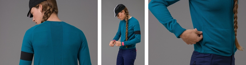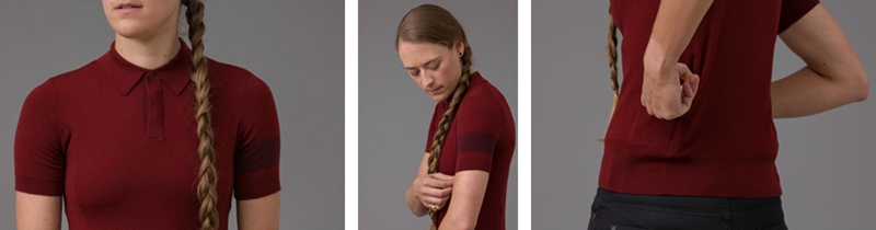 灵感源自传统的羊毛骑行服,修身裁剪,采用100%美利奴制造,领口、袖口和下摆罗纹处理保证贴合,背部有拉链口袋。