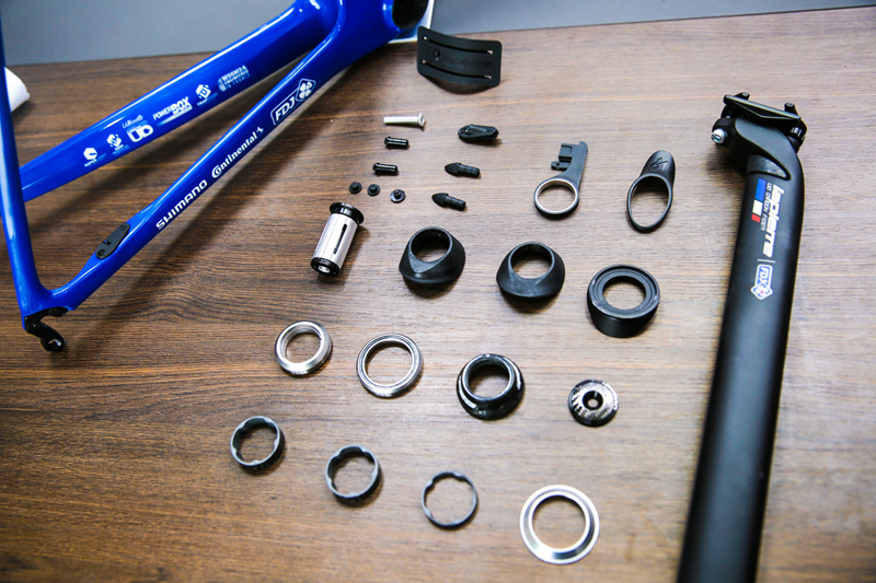 车架配件非常丰富,有4款不同的碗组盖供选择,还提供了3个高度不同的垫圈。
