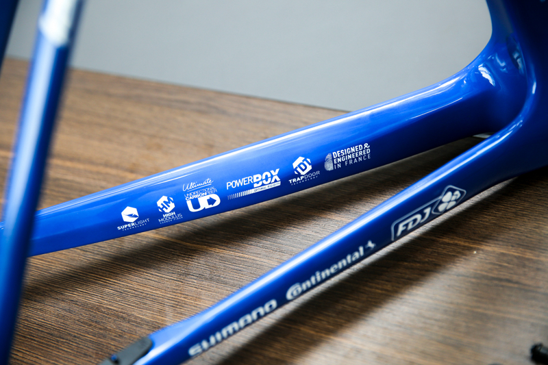 上管接近头管处标注着皮诺的名称,意味着这是一款GC车手定制版的涂装。