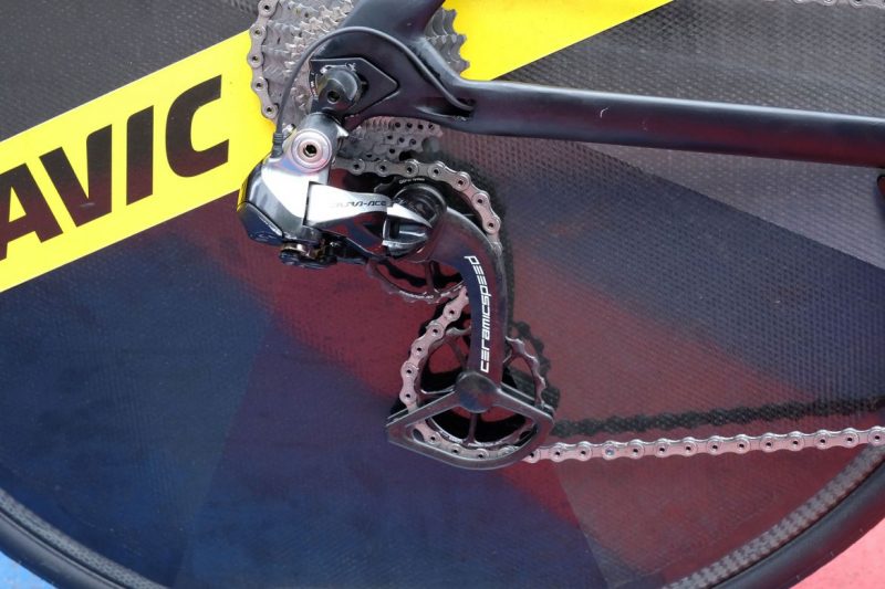 如果你们一直关注今年环法上的车手战车,可能已经注意到使用CeramicSpeed的OSPW(Oversize Pulley Wheel)超大导轮系统的战车数量已经超出了我们的想象。除了商业赞助以外,形似Shimano Altus M310后拨上的大导板系统看起来有点呆,之所以能脱颖而出,肯定是超大导轮能为车手们提供足够的节省功率优势,才让他们放弃战车的格调……