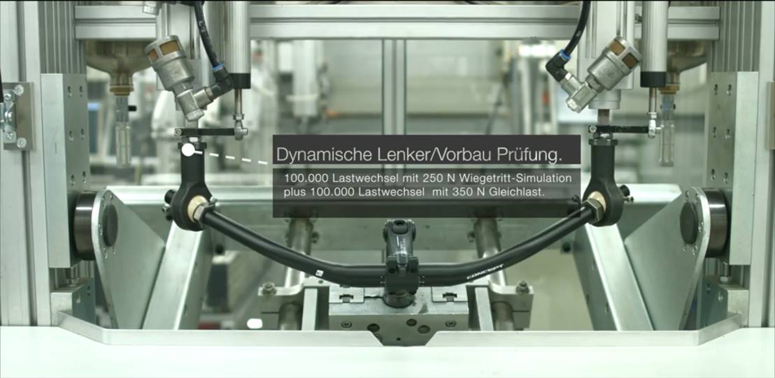 ▲车把疲劳测试(见ISO4210-5:2014, 4.9项),Derby Cycle在满足ISO标准的前提下还会旋转25°对车把进行疲劳测试。