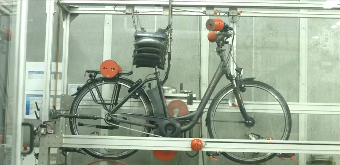 整车的荷重动态测试:座管处2*18kg、曲柄处2*18kg、车把处2*6.75kg,后货架有三个等级的重量10kg、18kg和25kg,滚筒上装有10mm厚的台阶块模拟路上的颠簸,滚筒的直径在500mm-1000mm之间,然后模拟8km/h(±10%)的速度进行至少6小时不间断测试。(见ISO4210-3:2014, Annex A)。