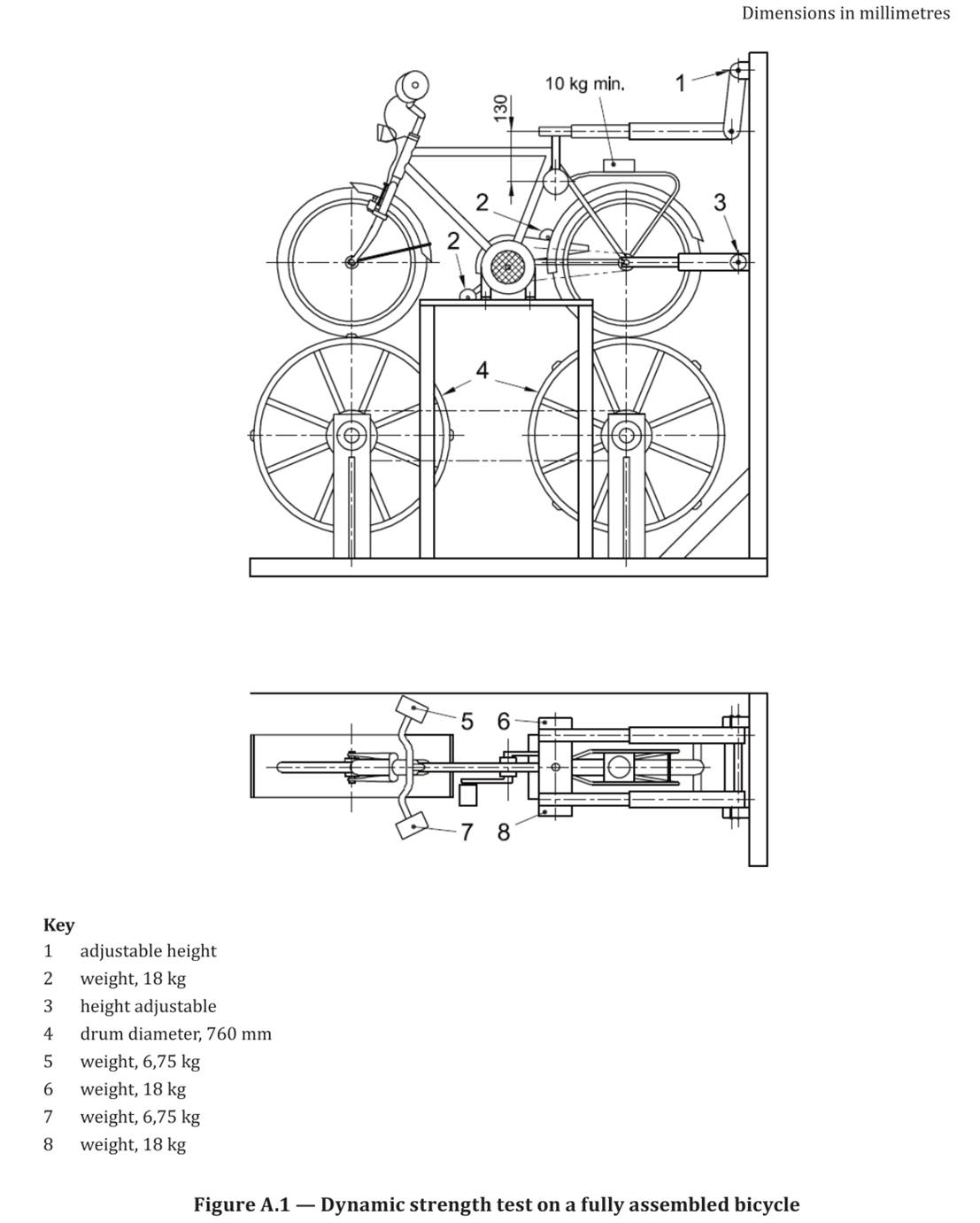 整车的荷重动态测试:座管处2*18kg、曲柄处2*18kg、车把处2*6.75kg,后货架有三个等级的重量10kg、18kg和25kg,滚筒上装有10mm厚的台阶块模拟路上的颠簸,滚筒的直径在500mm-1000mm之间,然后模拟8km/h(±10%)的速度进行至少6小时不间断测试。(见ISO4210-3:2014, Annex A)。