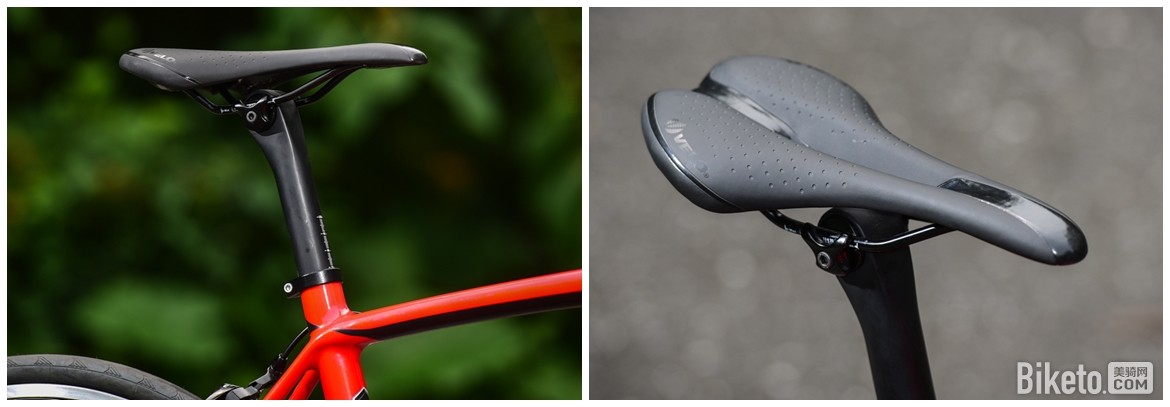座管为一根31.6口径的碳纤维座管,使用左右夹的夹具结构,调整非常方便,但就是总感觉这座管好像在哪见过……坐垫则是一只宽度较窄的VELO坐垫。