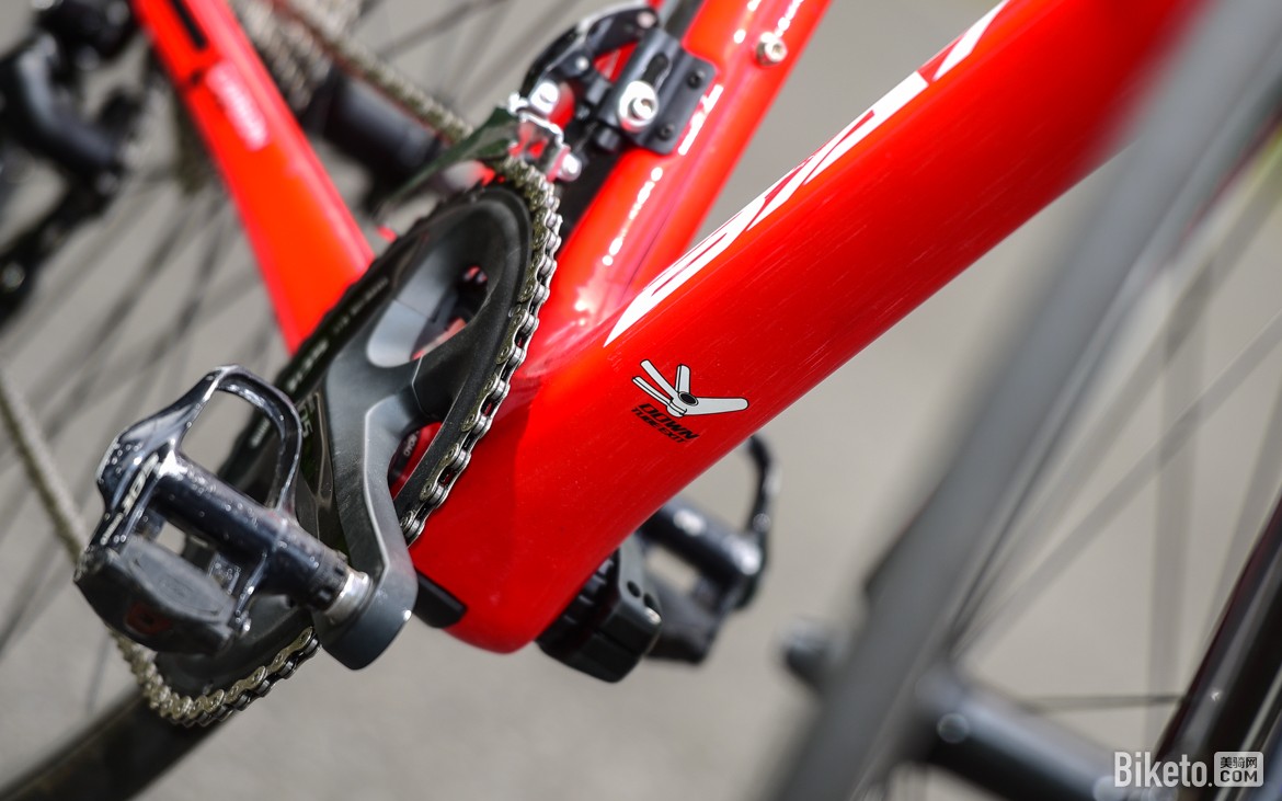 平直的前叉底挡部分使用大口径设计,但叉肩左右间距较窄,叉腿均为三角形截面,最大支持25c外胎,属于比较老派的造型设计。叉脚上的Logo是象征使用了CFD技术,你们一定会认为:“哦!一定是经过流体力学计算(Computational Fluid Dynamics)的气动设计!”但真相就是CFD代表的是Carbon Fiber Dropout,全碳叉脚设计,这可是正儿八经的全碳前叉!像这样的“炫技”的Logo后面还有许多。