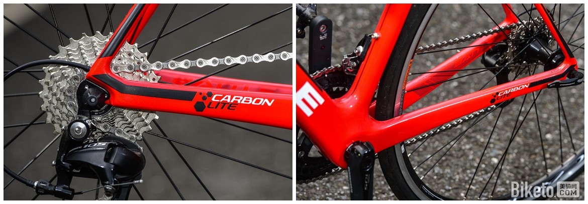 第一个“写轮眼”Logo表示……跑题了,是Smooth Wall Carbon技术,成型时使用双EPS内膜填充,使车架内部平整光滑,没有皱褶,提高车架性能。T+M Tachnology则表示车架使用东丽T700高强度碳纤维+M40高模量碳纤维的组合来优化性能。
