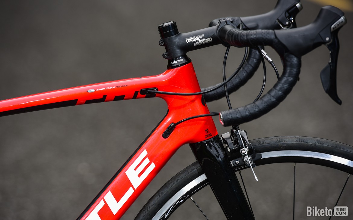 操控组件方面,车把则是一套Controltech的ONE系列铝合金把组,使用经典的圆形上把,搭配压缩弯型,75mm Reach和128mm Drop的数据对用户非常友善,可以适应大多数人的使用习惯。