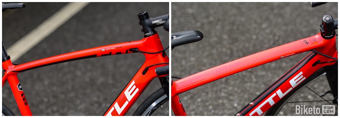 上管使用倒三角形由粗往扁渐变,与闪电的Tarmac颇为相似,据说可以优化舒适性。同样红色的Windseeker 600 Logo显得不太明显,想必大家都看到头管后面又有Logo了。