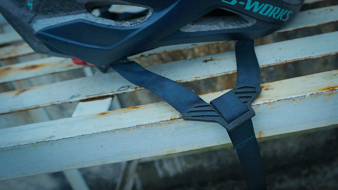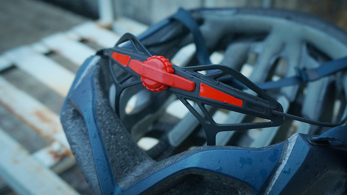 KASK这种“意”味十足的品牌喜欢在这里整块皮子,太奢了,其他牌子这里会搞块魔术贴,把多余的带子收纳起来。在闪电这,这都不叫事。三点固定的束带系统以及基本固定了耳侧的束带长度,需要调整的仅有耳根到下巴的束带长度,这样一来,一个简单的橡胶圈就能把多余的束带安稳的固定。在此吐槽“对家”的Velocis,束带调节系统略显啰嗦。当然三点固定的束带也会闹出笑话,有的兄弟据说天生相貌出众,戴了闪电头盔哪哪都很合适,就是脑门高耸,束带一比就短了,导致耳朵塞不进去,当然,这是十分罕见的个例。