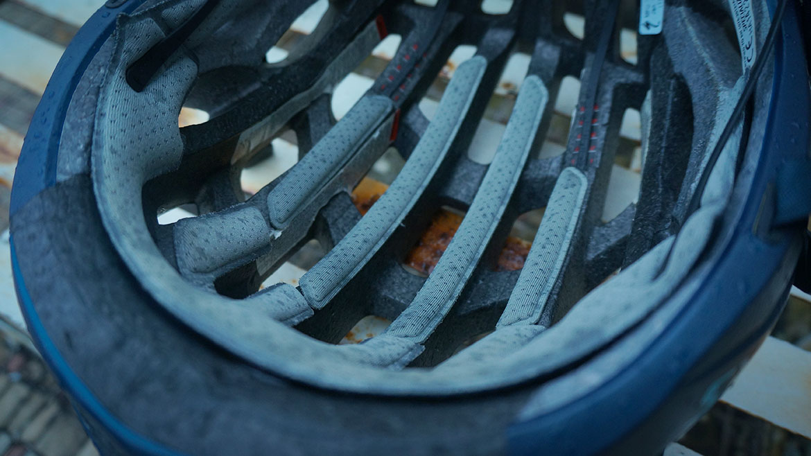 类似帕特农神庙之于劳斯莱斯,霍夫曼斯特拐角之于宝马,尾部高耸的五根“立柱”是闪电头盔代表性的设计,造型仿佛在致敬最早于1947年出现在环法赛场上的Danish Helmet——小皮帽。疑似为了偷轻几克,闪电没有把Prevail II设计成一代那样“全包”的尾部,反而裸露出大面积的泡沫,几个缺点:一是没有识别度了,往后一看都是黑压压的泡沫,车群里一扔找不到了。二是一压一个印子,指甲、硬物、磕碰,这头盔比一代难保养。倒不是会对功能造成什么影响,关键是掉价。