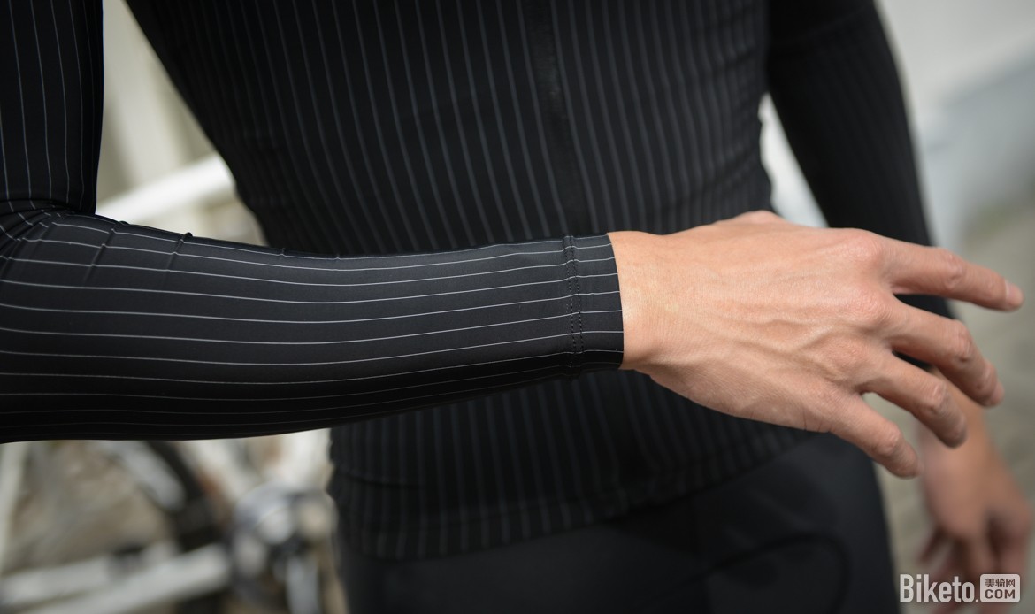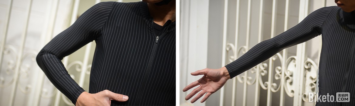 肩部,是自行车骑姿的迎风区域,薄款长袖的条纹骑行服虽然并未跟随短袖款般使用肩内拼接的方式缝合衣袖与前后片,但由于袖长的延伸,从肩部到手臂的区域却有了更好的包裹,能更充分地利用面料自身的弹性,触感犹如一片轻薄的羽毛落在臂上。