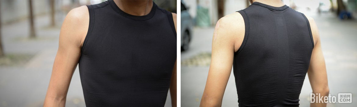 虽说基础款无缝打底衫的面料有着高透排汗技术加持,但面料还是有着一定的厚度,并不算薄,也许并不适合于32摄氏度以上的炎热天气使用,配合薄、厚款骑行服穿着应对的温度范围应是10-28摄氏度之间。