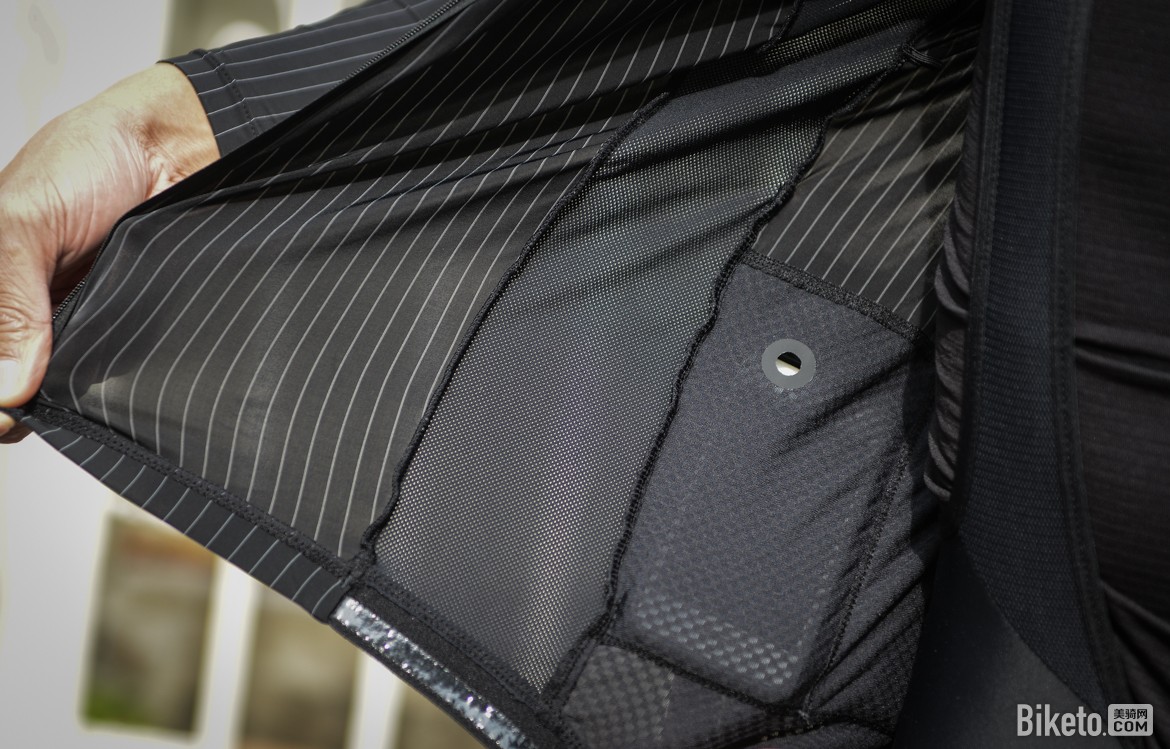 此外,背袋与整件骑行服上衣后片的缝合也是值得一提,背袋区域的内部特意加厚了氨纶面料与缝线补强,以确保背袋承重的耐用性,这是个看不见但用得很舒服的细节(可见下图)。