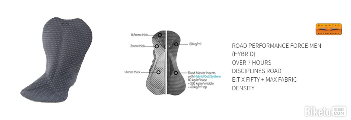 裤垫依然采用了行业标杆意大利Elastic Interface的制品,即我们经常简称为“E.I”的那个。ROAD Performance Force(HYBRID)级别的衬垫,根据公路骑姿的压力分布使用了多种不同密度、厚薄的泡棉,并且在主要骑乘区域还应用了80kg/m3基底、200kg/m3中部、60kg/m3顶部多密度Hybrid Cell System技术、EIT X FIFTY、MAX FABRIC DENSITY技术等多个技术,配以了极佳的衬垫缝纫位置,让衬垫发挥出其应有的舒适表现,满足7小时以上的超长时耐力骑乘需求。