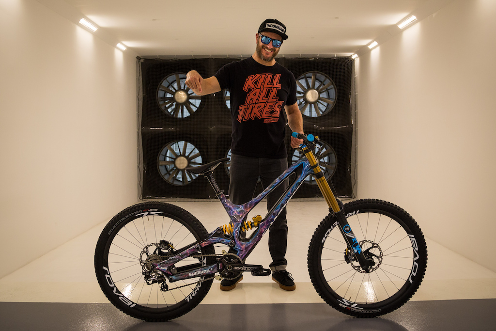 当时Specialized送了一辆S-Works Stumpjumper,他想来点不一样的新花样,于是乎就把车子拿去了英国“Death Spray”进行涂装设计。整体设计也和他的职业紧密相连。这辆Stumpjumper整体使用黑白涂装,设计灵感来源于十分经典的1991福特 Escort RS Cosworth汽车,这也是他在第十部Gymkhana漂移大片中驾驶的赛车。在白天看起来十分低调,平淡无奇。