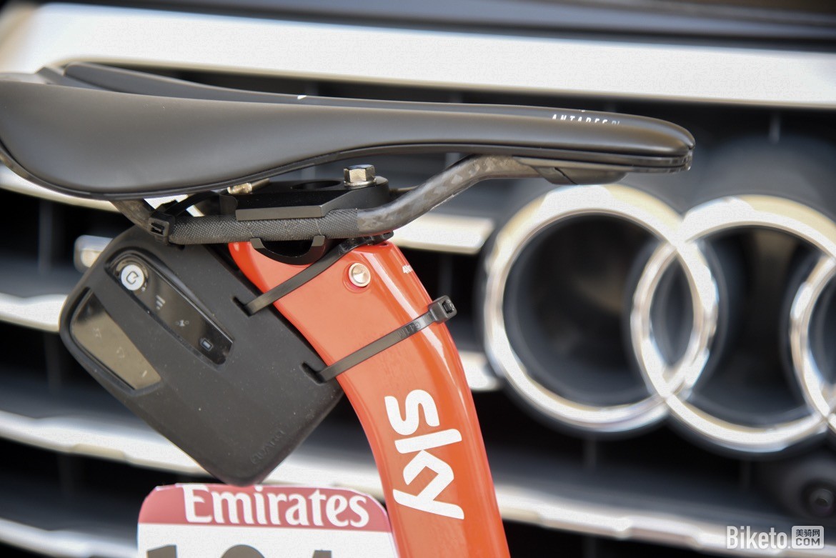 ▲座垫下方的Quarq实时数据发射盒用来记录比赛数据,让观众们更直观地了解车手和比赛