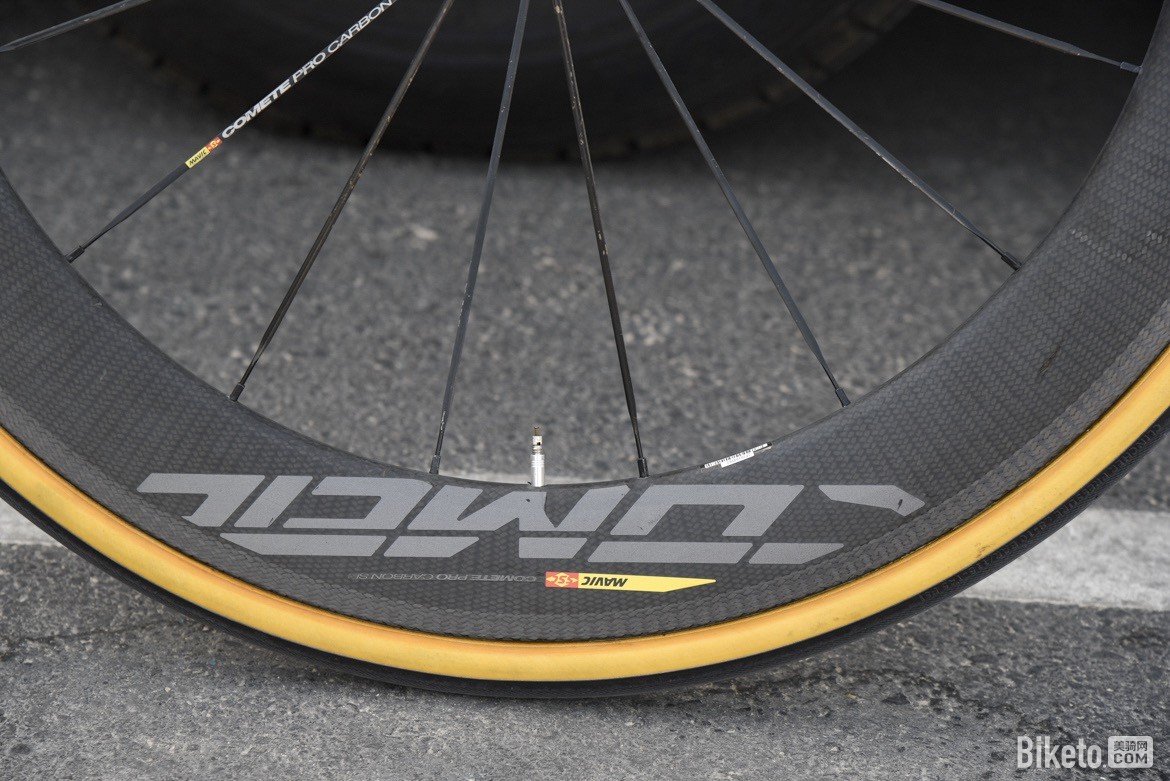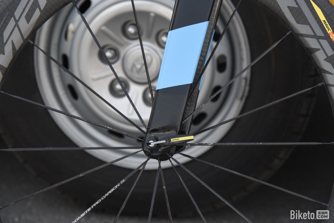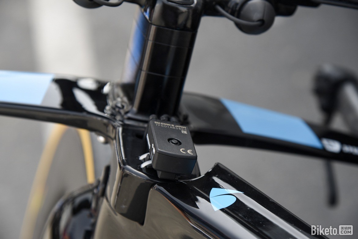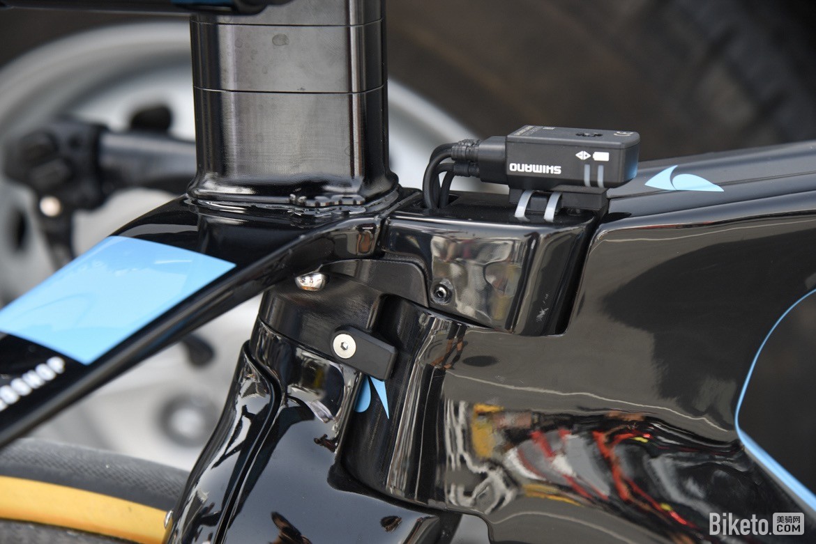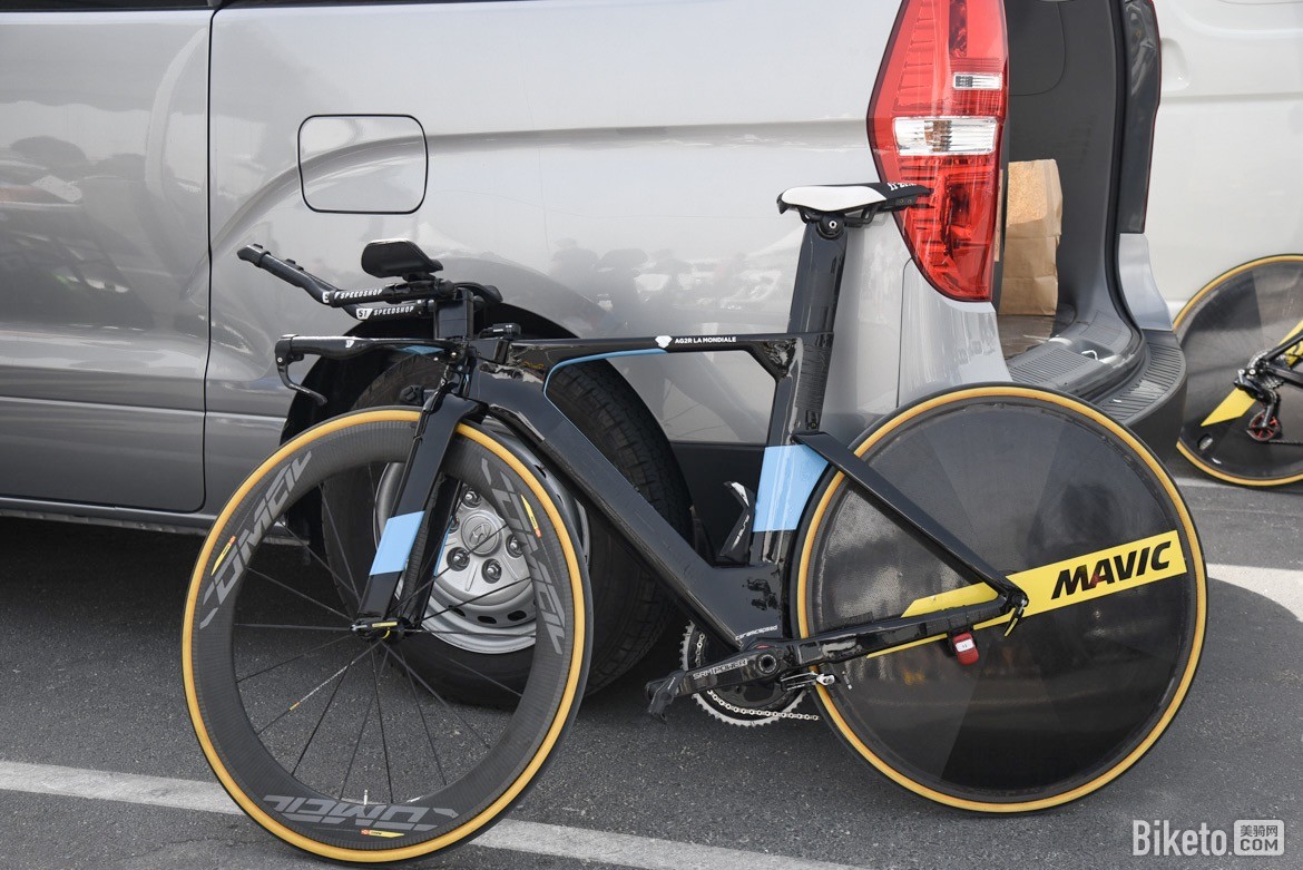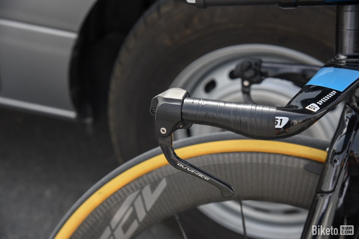 在2019赛季,“车王牌”Eddy Merckx取代Factor成为AG2R车队的车架赞助商,由于Eddy Merckx暂时还没有计时车型,所以AG2R车队在环阿联酋计时赛段仍拿出“库存”的Factor Slick参赛。我们的前线记者Nel就拍到了这台布沙尔的无标Factor Slick,不得不感叹,电工胶布真是万能。