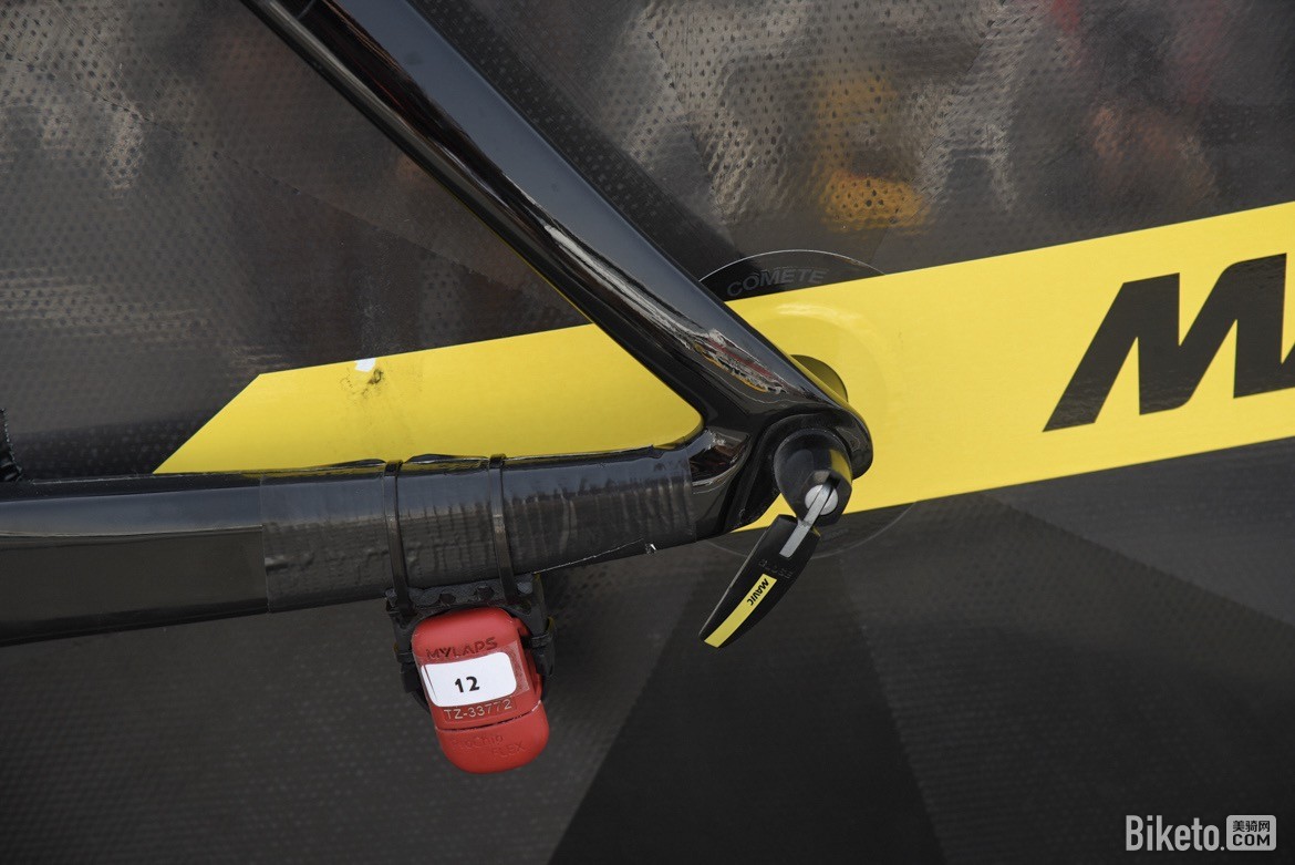 ▲计时芯片上写着布沙尔的参赛号码,为了防滑和遮标,后下叉同样裹着一层电工胶布