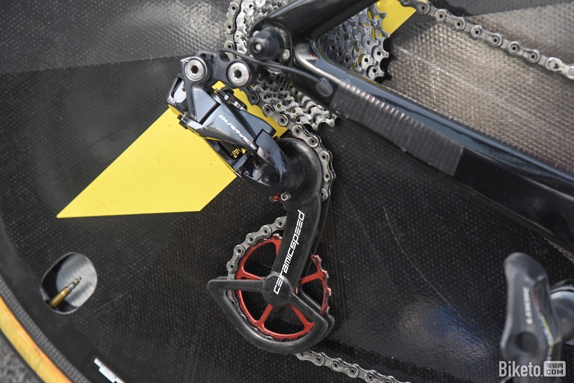 ▲Factor赞助时期遗留下来的CeramicSpeed OSPW大鸡腿后拨导板