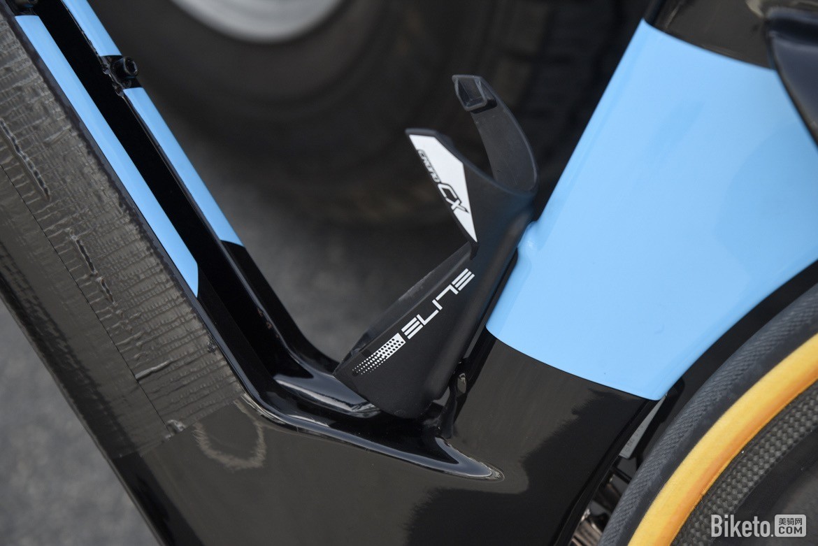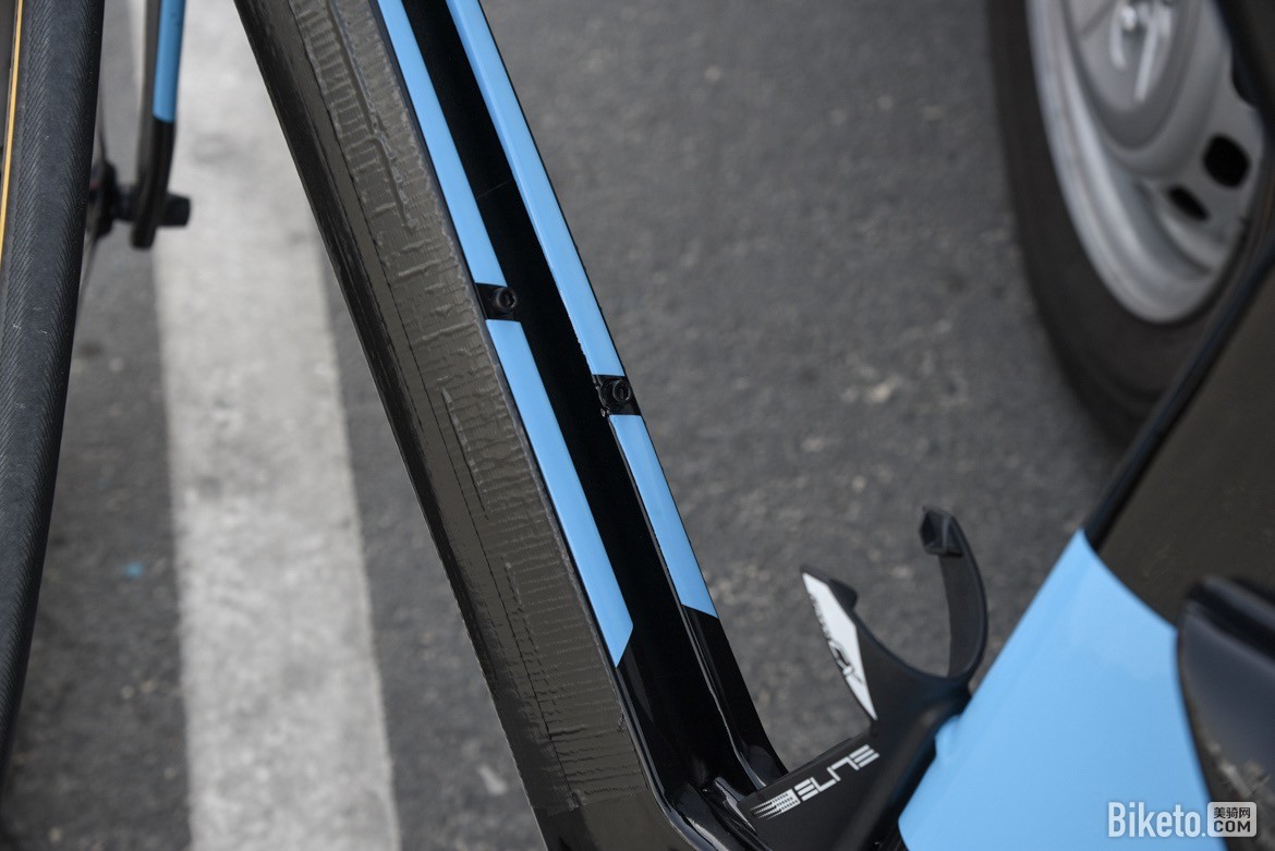 Factor独有的分离式双叶片下管在Slick上被进一步优化为Twin Vane Evo双叶片进化管型,可以让空气更平顺地通过下管,减少乱流和空气阻力。下管的品牌logo被用电工胶布整整齐齐地覆盖住,不细看真以为是一台无标战车呢。