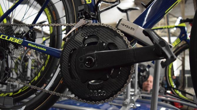 ▲这位旺蒂车队的车手使用SRM Origin功率曲柄搭配Carbon Ti盘片,并且用电工胶带覆盖了SRM的Logo