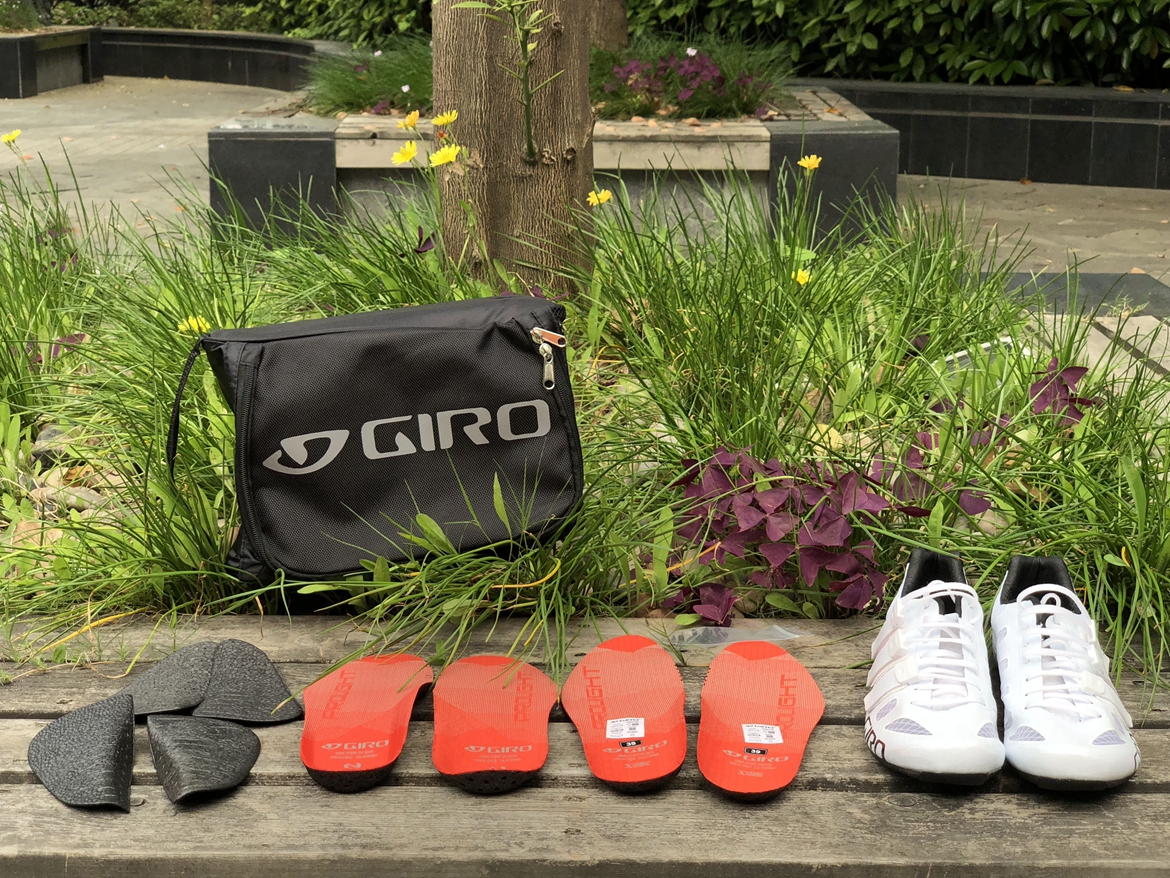 我并没有特别在意这双锁鞋的品质,比如鞋底碳纤维有何瑕疵,线头有没有修饰等。不过从表面来看,Giro丰富的配件包——三个足弓垫片,超轻鞋垫加一个锁鞋手提袋(还附带锁片螺丝),足以看出Giro对客户的诚意是多少。