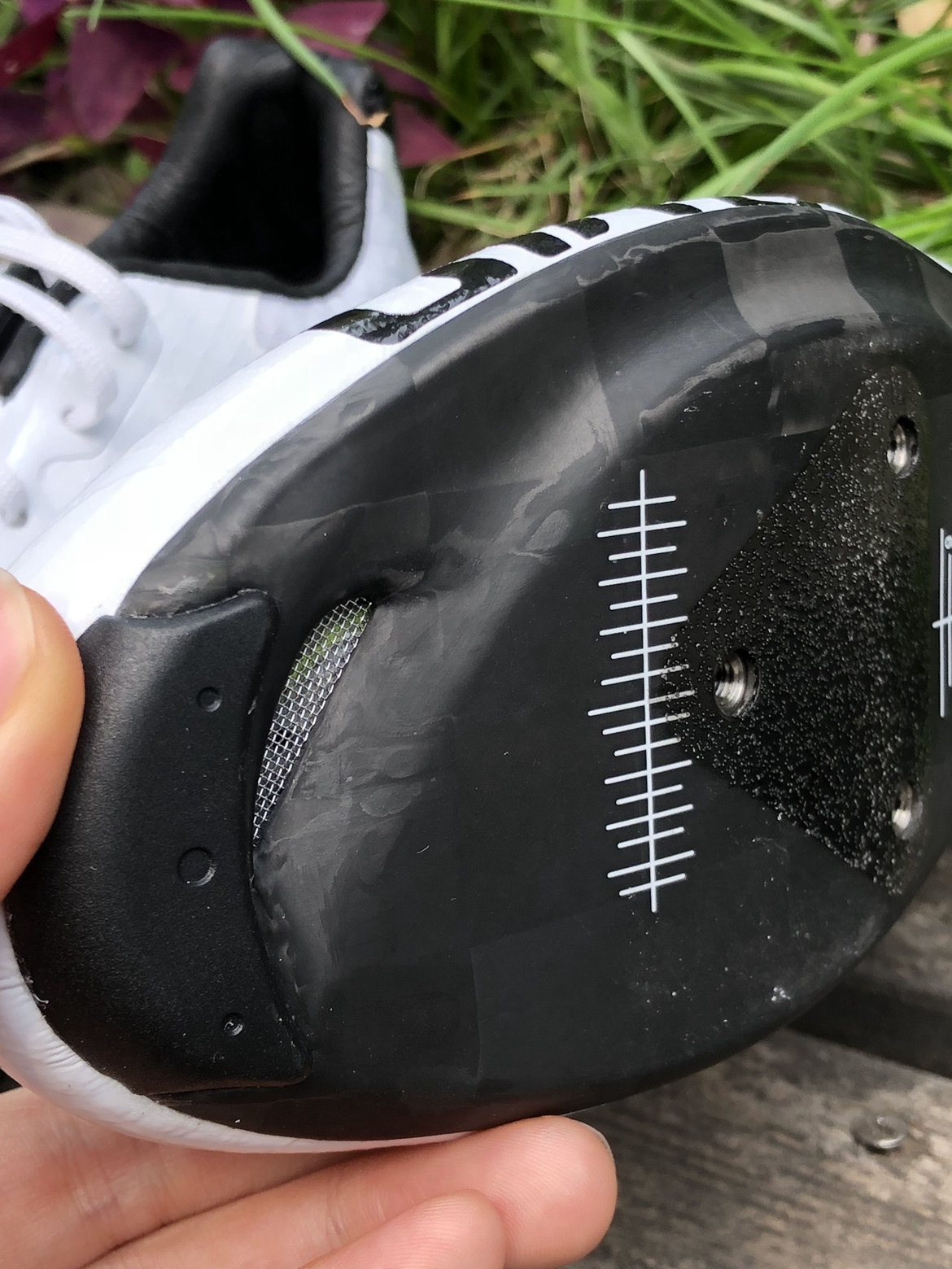 这双锁鞋从鞋头的正上方观察你可以发现它的设计比较讨巧,因为它不止于针对某个脚型。我们常见的脚型为:埃及、希腊和罗马。这款锁鞋无论你是什么脚型只要没有过宽的脚掌,能塞进合适尺码的鞋子,它都会不会太为难你的脚。而我则是希腊脚,穿这双锁鞋的时候会更贴合一些。而市面上的Bont和Fizik锁鞋则似乎只能满足于埃及脚,Bont也可以满足罗马脚,但Fizik则比较吃力,因为它的鞋头略尖。