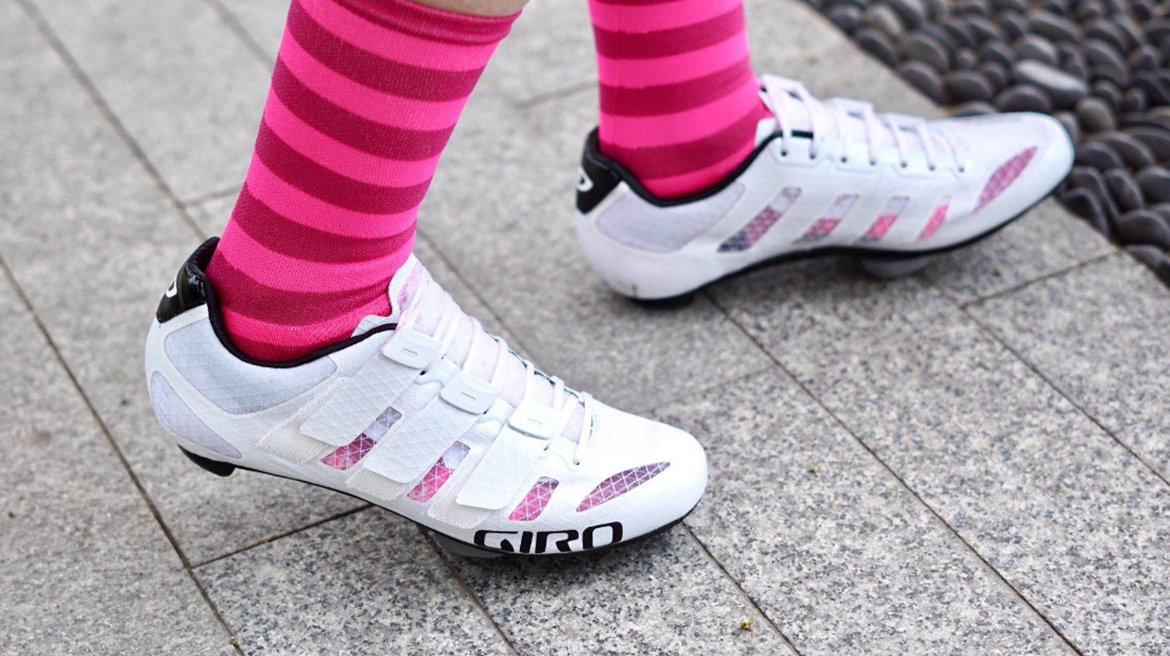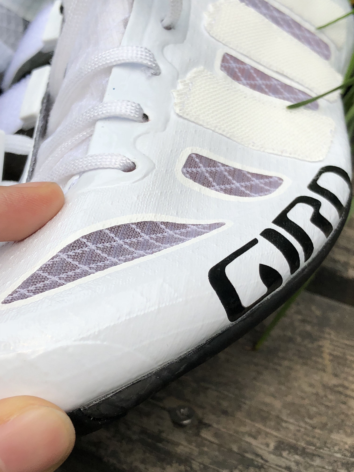 它的透气性真的非常不错,尤其是前脚掌部位。我认为很少有锁鞋的透气性能可以达到这样的高度。无论我是100公里左右的小长途,还是60-80公里左右的城市绕圈,我总能在骑行时感受到前脚掌的丝丝凉意。在骑行完毕之后脱下锁鞋,我会习惯性的摸一下自己的脚,观察袜子哪个部位出汗较多。我使用这双Giro Prolight骑行之后,袜子较潮湿的部位会在前脚掌和脚跟的加厚处。袜子的前脚掌脚底是踩踏的中心区域,很多袜子厂商会再次设计加厚做毛巾样式处理,起到脚底尽可能贴合及防滑的效果。而脚后跟是落在了锁鞋的密闭区域,这个部位如果做得过于透风可能另锁鞋的后跟防滑效果失去意义。不过整体优秀的透风性能,让我在穿Prolight的时候脚汗明显少于Shot。