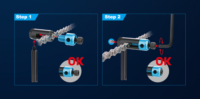 2、接着利用六角离式板手转到最底,使顶针紧密旋入安全盖,此时用点力气会听见“卡”的声音,松开安全盖取出链条将会看见链条轴心,代表打链成功。(如图示:Step2)