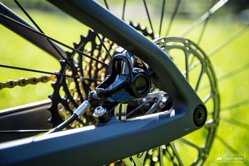 Rotor碳纤维曲柄搭配金光闪闪的SRAM XX1 Eagle传动套件,立式反装后胆,粗壮的下管保障车架所受到的强大冲击。全内走线设计即使在后下叉也添加线管保护,当然现在有更好的解决方案,那就是升级XX1 EAGLE AXS。