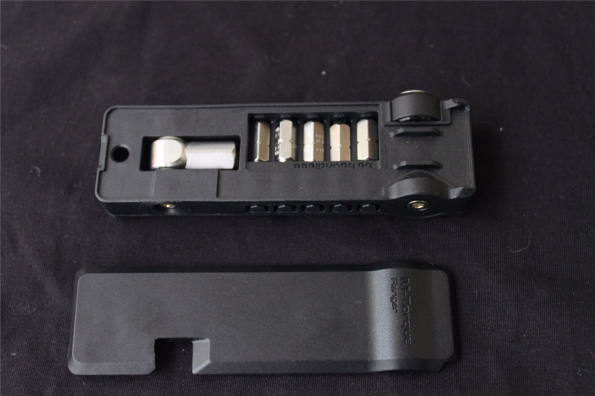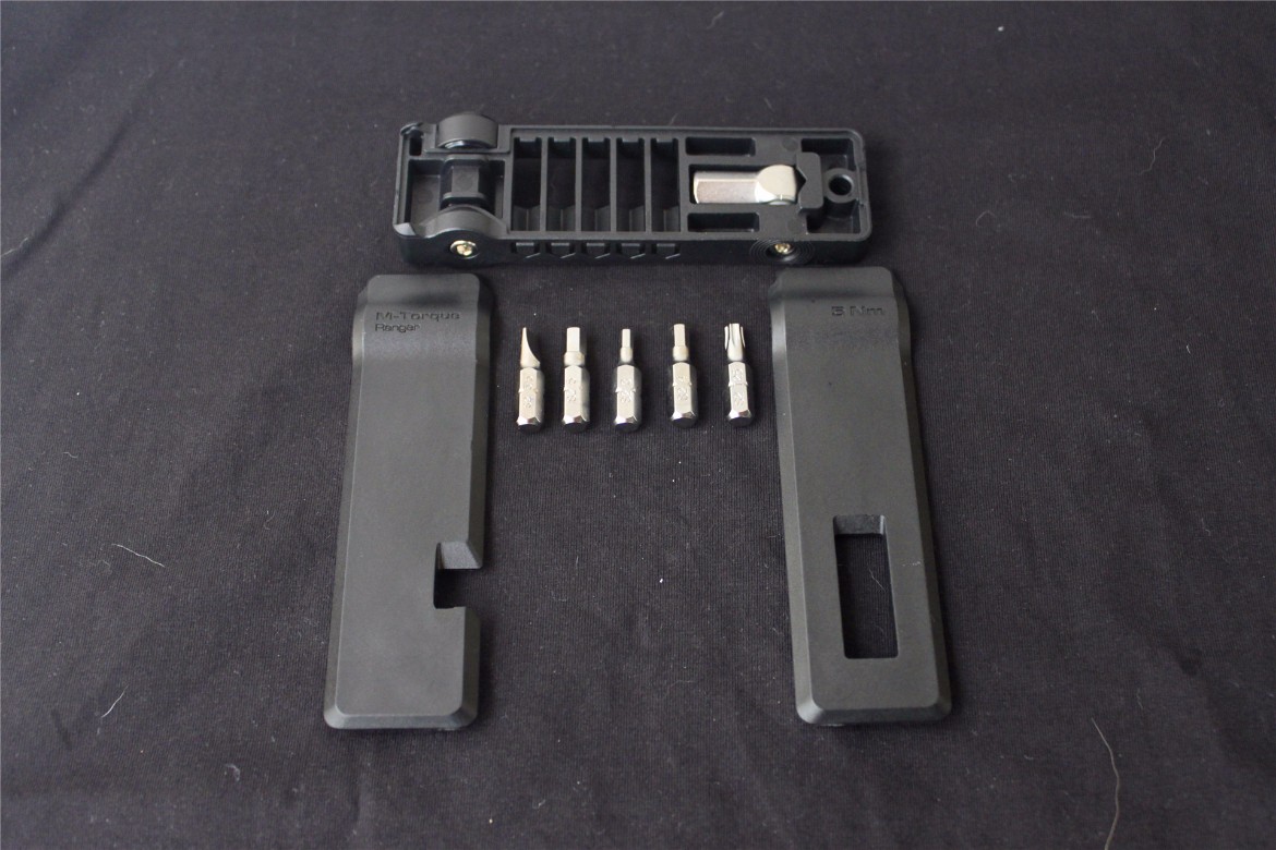整套工具的东西并不多,一个5NM定扭的扳手主体,中间有五个放置批头的位置,五个批头分别是3mm/4mm/5mm内六角、T25梅花扳手和一个一字批头,还有两个可以当做撬胎棒的塑料装饰盖。功能并不多,但是基本涵盖了日常能覆盖在这个扭力范围内需要用到的工具。