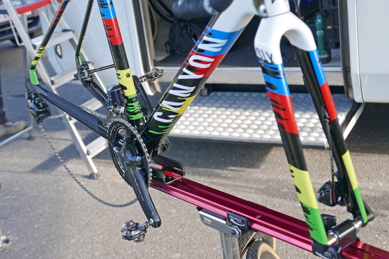 有着猎奇三通部位的Canyon Inflite CF SLX在上个CX赛季首次亮相。现任世界冠军范德普尔继续使用它参加去年的CX比赛。几乎每次他在起跑线上露面时,比赛都毫无悬念。 因此,世界冠军自然会获得一辆定制涂装的“彩虹车”。在上周末的2019 CX世锦赛,他骑着这辆彩虹车再次赢得了比赛。另外,西方记者们还发现了另外量辆定制的冠军涂装Inflites……
