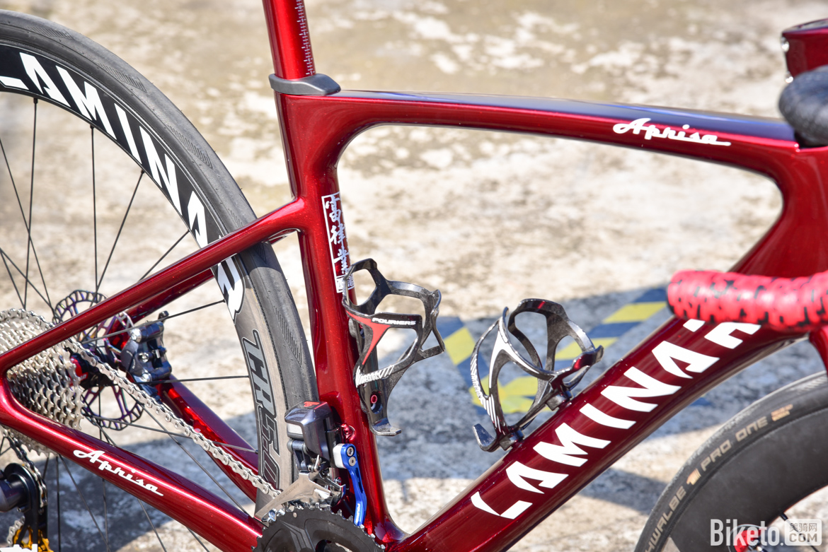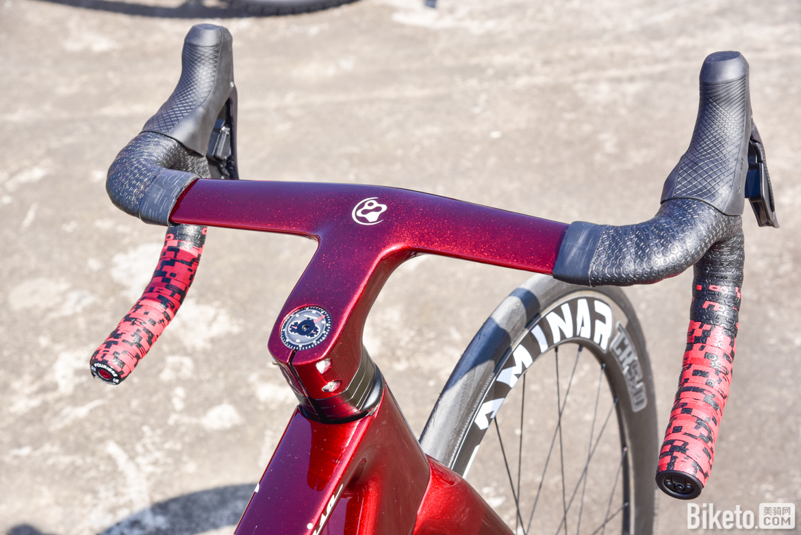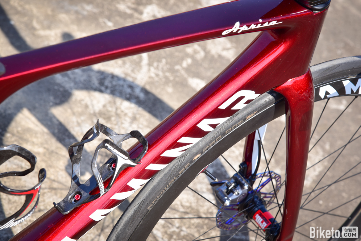 APRISA风速气动公路车,这款公路车基本上具备当下最热门的公路车属性:一体式整合把组、全内走线、142mm后叉开档,最大可容纳28mm碟刹轮组。