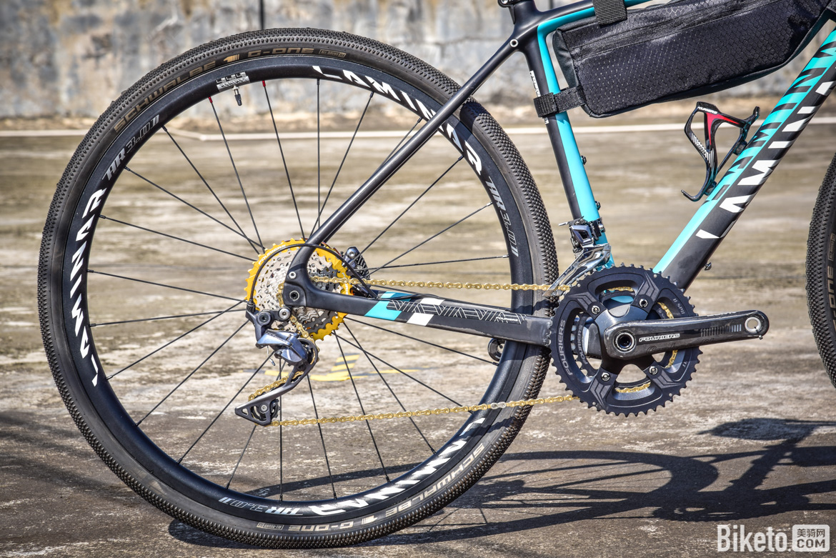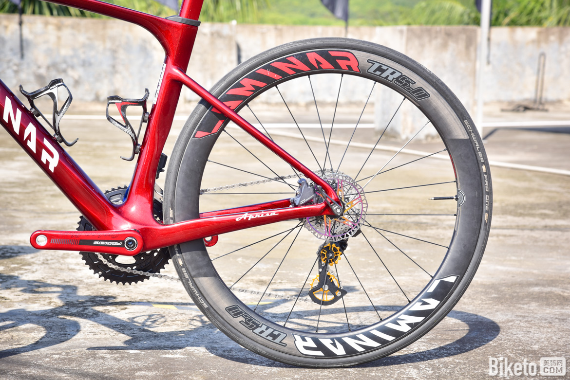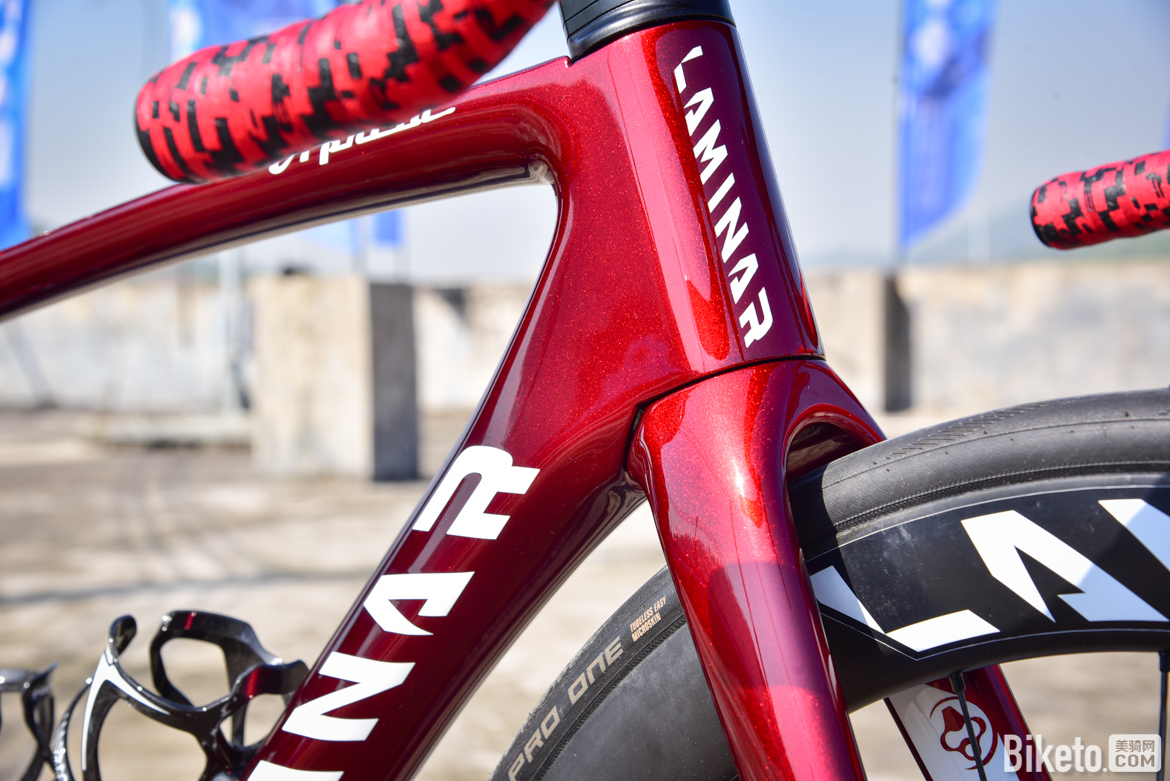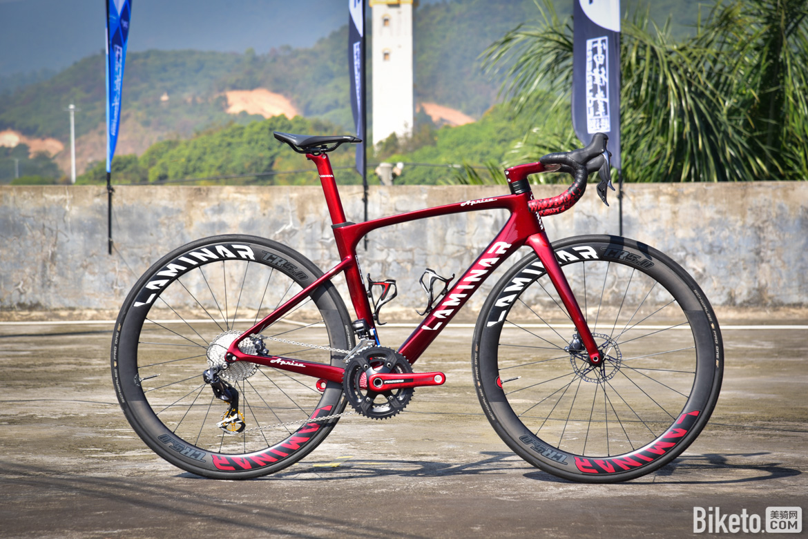 APRISA风速气动公路车,这款公路车基本上具备当下最热门的公路车属性:一体式整合把组、全内走线、142mm后叉开档,最大可容纳28mm碟刹轮组。