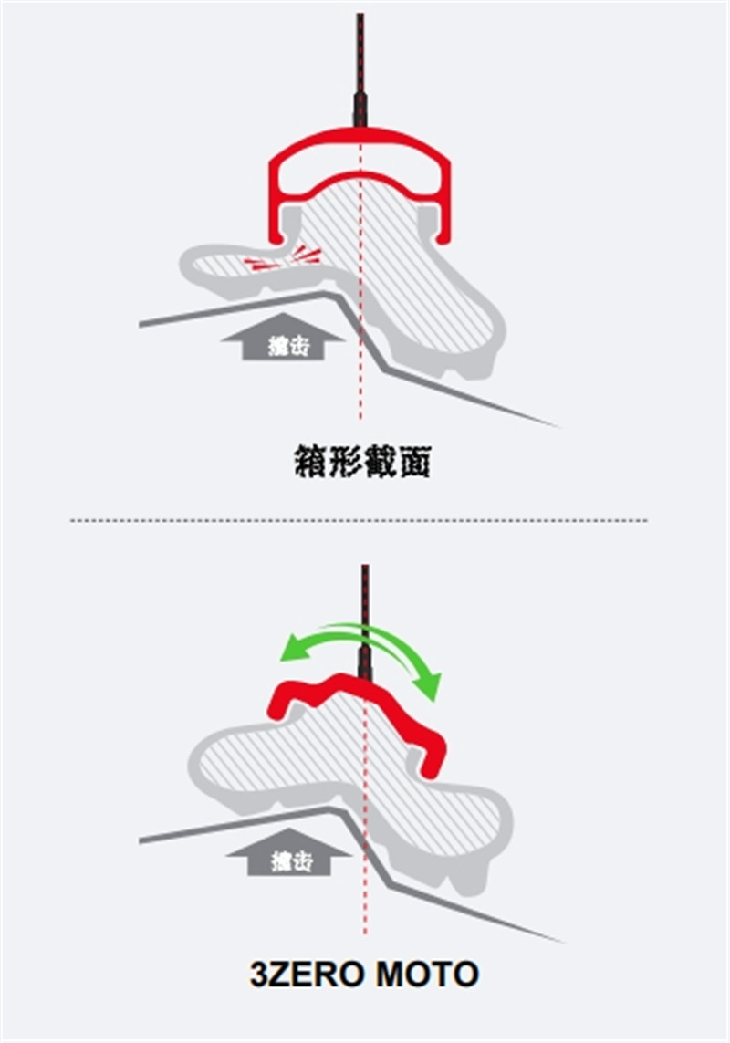 3ZERO MOTO轮组也将越野摩托的科技带到了山地车上。3ZERO MOTO轮组允许车圈在穿越崎岖地形时向辐条孔的任意侧“扭转”。 当车轮遇到障碍物时,车圈边缘的精心设计提供了吸震性。