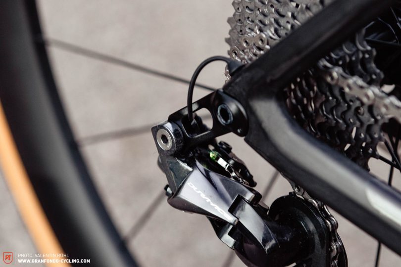 在我们的测试车款中,ROSE,FOCUS,Pinarello开始用上了直装尾钩。这项从山地车上借鉴而来的技术让换挡更加稳定了。