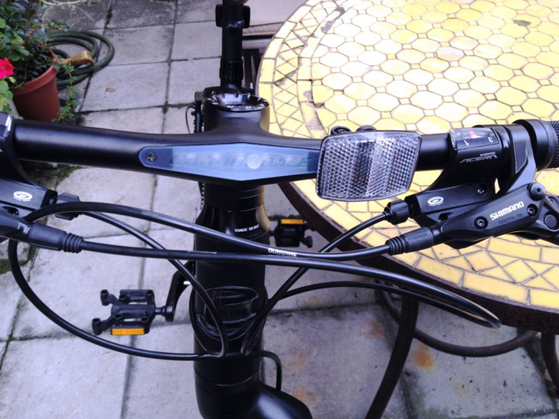 Cannondale是特别喜欢搞整合式光源的品牌。在上一代BADBOY城市车上,就将前灯整合在了一体车把上。虽然外观很整洁,但是充电非常麻烦,需要拆卸车灯。