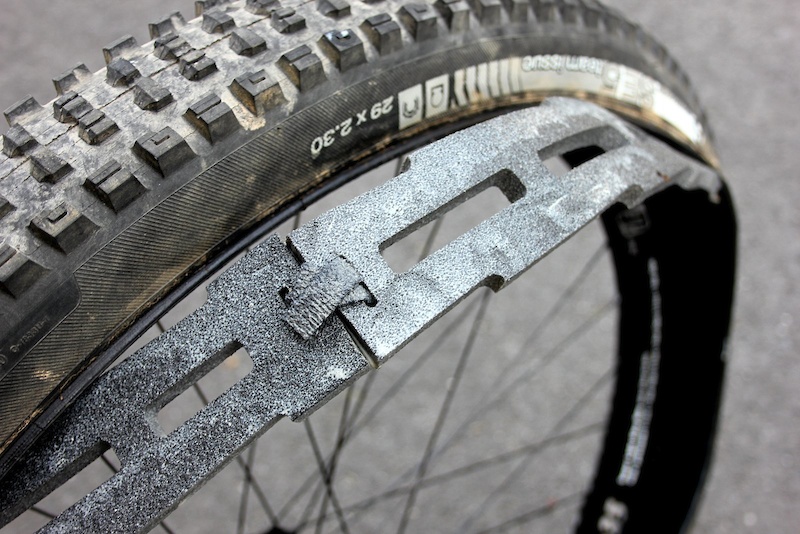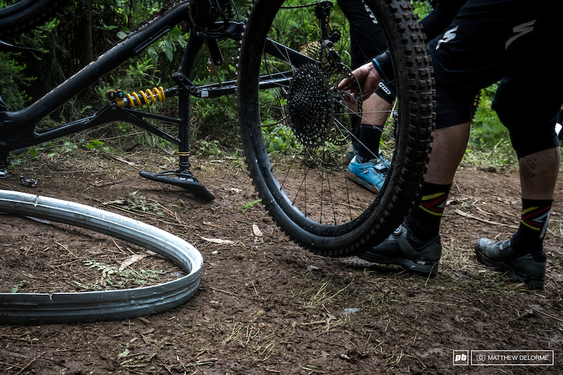 当然,轮胎填充物并不能保证百分百可靠,有的时候也会出现意外,造成爆胎甚至是脱圈的发生。因此,绝大多数车手(EWS)还是会带上备用内胎和 工具,以备不时之需。