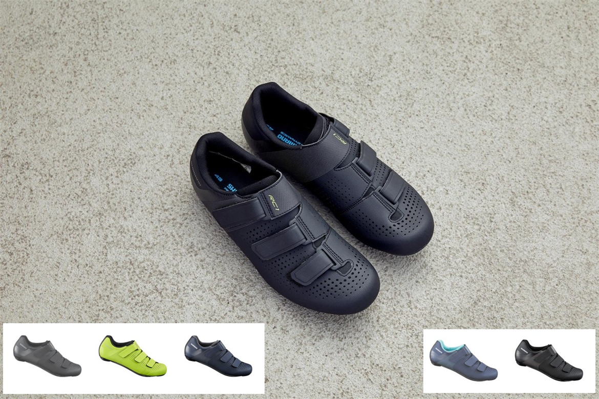 与RC3同时发布的,还有SHIMANO的另一款入门级公路锁鞋RC1,与RC3寻找舒适以及踩踏效率之间的平衡不同,RC1则更加看重穿着的舒适性,因此,RC1舍弃了BOA旋钮的锁紧机构转而使用了更加舒适的魔术贴绑带设计。鞋底方面RC1使用和和RC3同为6级硬度的玻璃纤维强化尼龙底,但结构方面有着比RC3更加宽大的鞋跟以增加走路时的稳定性。鞋面方面使用了带有大量透气孔的网状纹理的合成革,可以让魔术贴不用拉的太紧就能稳定固定住脚面。这种鞋底设计以及鞋面结构更多的传承自之前更加偏向舒适的RP系列,是追求舒适性的入门车友的首选。RC3官方给出的重量为42码238克,非常轻盈。同样提供女款可选,男款的颜色为黑色,黄色,藏青色,而女款的颜色为藏青色、黑色两种颜色。