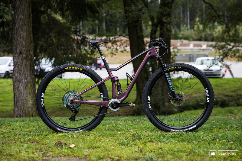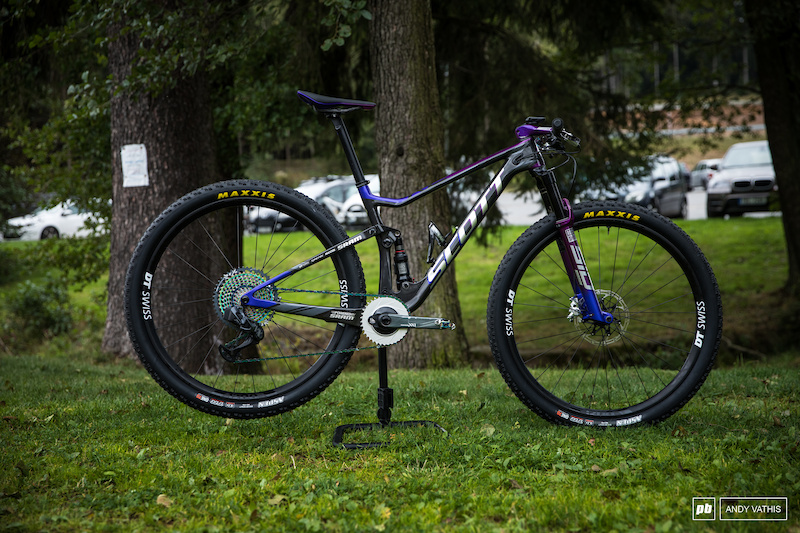Nino Schurter和Kate Courtney带着两台定制涂装的战车首次亮相2020年山地车世界赛场,Nino的SCOTT Spark的涂装由紫色和蓝色组合在一起,而且Nino装备了一整套限定涂装版的紫色锁鞋,手套和头盔。关于这两台战车,我们想好好观察一下新的涂装和战车设定。